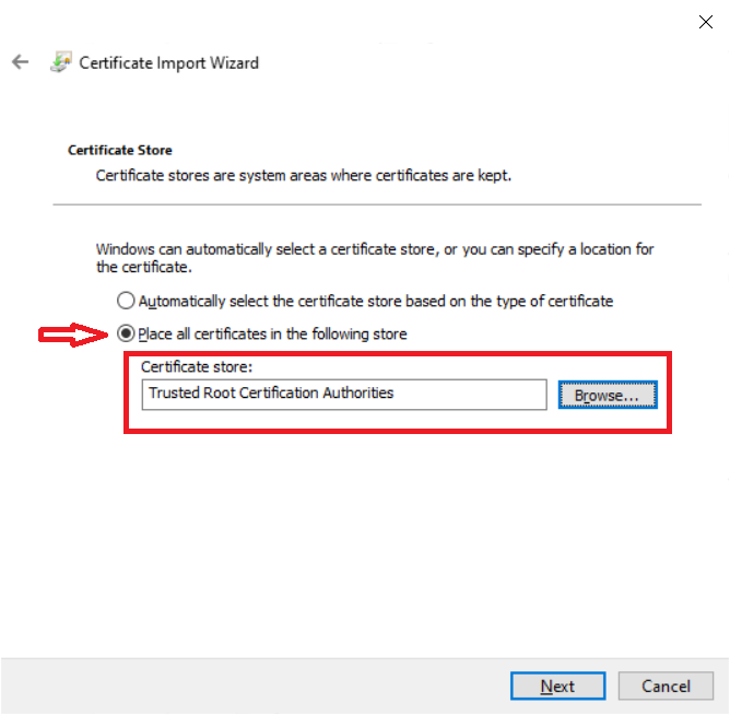 در مرحله ی بعد گزینه ی Place all certificates in the following store را انتخاب کنید. با فشار دادن کلید Browse گزینه ی Trusted Root Certificate Authorities را انتخاب نموده و کلید Next را فشار دهید.