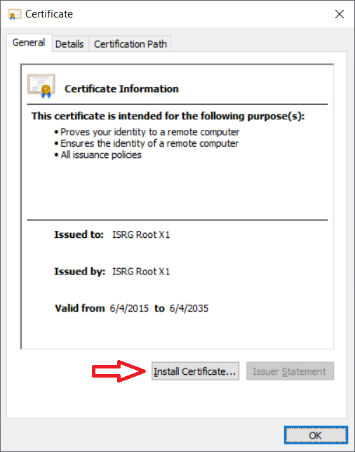 این فایل با پسوند der در دستگاه شما ذخیره می شود. بر روی آن دوبار کلیک کنید. تصویر زیر ظاهر می شود. روی کلید Install Certificate برای نصب گواهی ریشه کلیک کنید.
